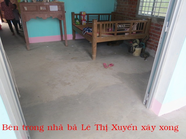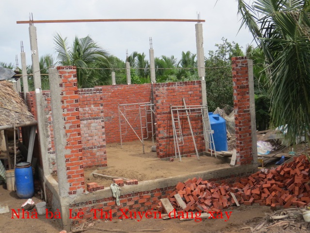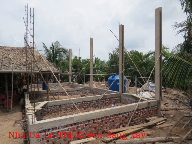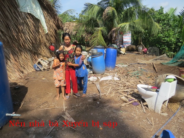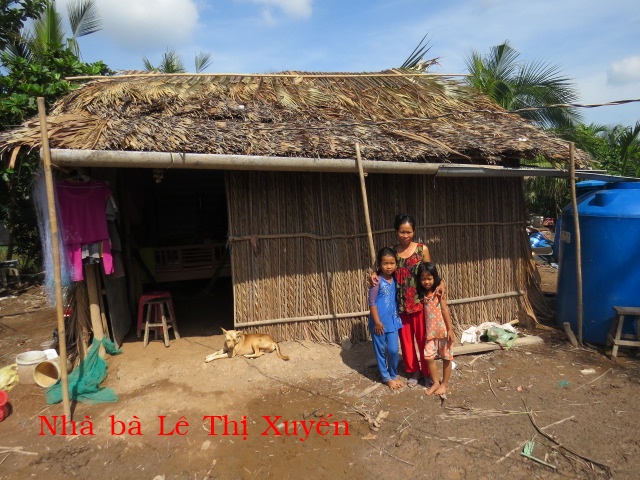 Bà Lê Thị Xuyến 41t chưa có số nhà ở ấp An Khương xã An Điền huyệ Thạnh Phú tỉnh Bến Tre. Gia đình có 5 người: vợ chồng và 3 con, hàng ngày cả 2 vợ chồng ai thuê gí thì làm nấy thu nhập chỉ đủ mua gạo. Căn nhà được cất nay hơn 6 năm, cách nay khoang hơn 10 ngày căn nhà bị sập hoàn toàn mà không có tiền cất lại. Hiện tại gia đình lấy cây lá củ đã bị sập che lại để trú nắng mưa.