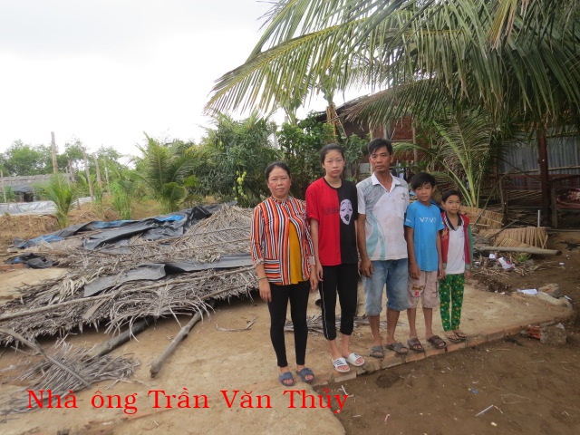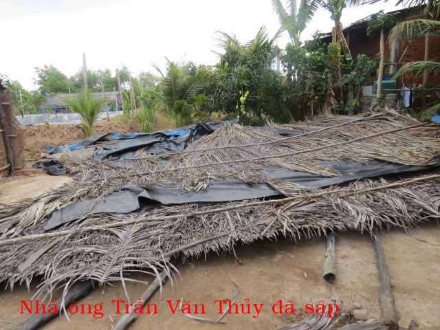 Tran Van Thuy, 44 years old, resides at 106/1 Con Tra hamlet, Thanh Hai village, Thanh Phu district, Ben Tre providence. He and his wife have 3 children. The children are still in school. Every day, both of them work whatever job is available. When they don’t have job, they go catch and sell sesarmid to buy food. They make only enough to buy food. Their house was built 6 years ago; 2 days ago their house collapsed and luckily no one was home at the time. They are poor and in need money to rebuilt the house