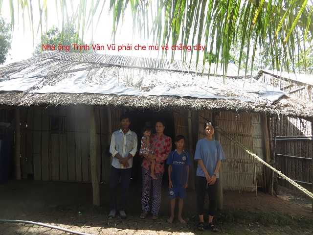 Ông Trịnh Văn Vũ, 38 tuổi, vợ bà Đỗ Ngọc Huy, 37 tuổi. ông bà có ba người con lần lượt là Trịnh Huyền Trân 17 tuổi học lớp 11, Trịnh Văn Hoàng Trung 13 tuổi học lớp 8 và Trịnh Ngọc Trân 2 tuổi. Ông Vũ đi làm phụ hồ mỗi ngày được 220.000 đồng (10 đô) mà phải nuôi sống cho 5 người nên khó mà đủ ngày hai bữa. Nhà ông Vũ cư ngụ tại địa chỉ 196/4, ấp thạnh Mỹ, xã Mỹ An, huyện Thạnh Phú, tỉnh Bến Tre. Nhà Ông Vũ cột đã gãy và kèo bị gãy cụp xuống nóc nhà và chỗ ngủ đều phải che mủ cho mưa khỏi dột. Nhà ông Vũ phải chằng chống nhiều chỗ để không bị sập nên không biết chuyện gì sẽ xảy ra khi mùa mưa bảo đang đến gần. Nhưng do vợ bị bệnh nên không có khả năng lao động, cho nên việc xây lại ngôi nhà để che nắng mưa là vô cùng khó khăn.