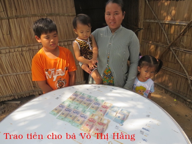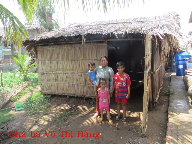 Bà Võ Thị Hằng 26t chưa có số nhà, địa chỉ ấp An Ninh xã An Qui huyện Thạnh Phú tỉnh Bến Tre. Gia đình có 4 người: bà và 3 con. Vì nghèo mà chồng bà bỏ đi nay hơn 2 năm, lúc đang mang bầu bé thứ 3. Một mình nuôi con khó càng thêm khó, hàng ngày cuộc sống ai thuê gì thì làm nấy rất bấp bênh lại thêm bà Hằng hơi khờ nên rất khó. Căn nhà hiện tại rất nhỏ, chỉ to hơn cái chòi chút xíu, và bị dột nát sắp sập là chổ trú ngụ của 4 mẹ con. Với hoàn cảnh của bà Hằng thì không thể có khả năng xây lại nhà.