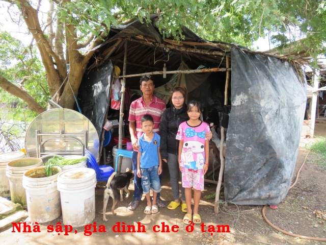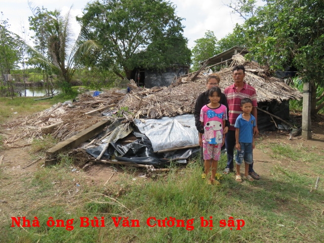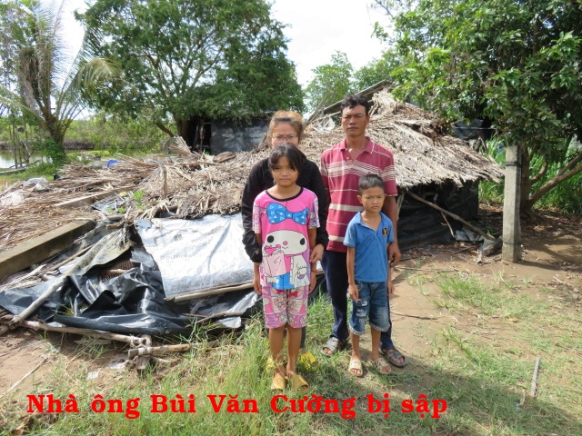 Ông Bùi Văn Cường 37t ở Cồn Rừng xã Thạnh Hải huyện Thạnh Phú tỉnh Bến Tre. Gia đình có 4 người: vợ chồng và 2 con. Hàng ngày cả 2 vợ chồng ai thuê gì thì làm nấy nhưng thu nhập bấp bênh chỉ đủ mua gạo. Căn nhà được cất nay hơn 6 năm, cách nay 10 ngày đã bị sập. Hiện tại không tiền cất lại.