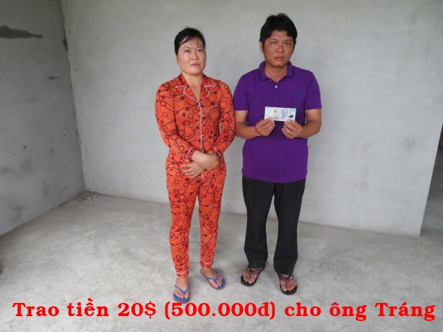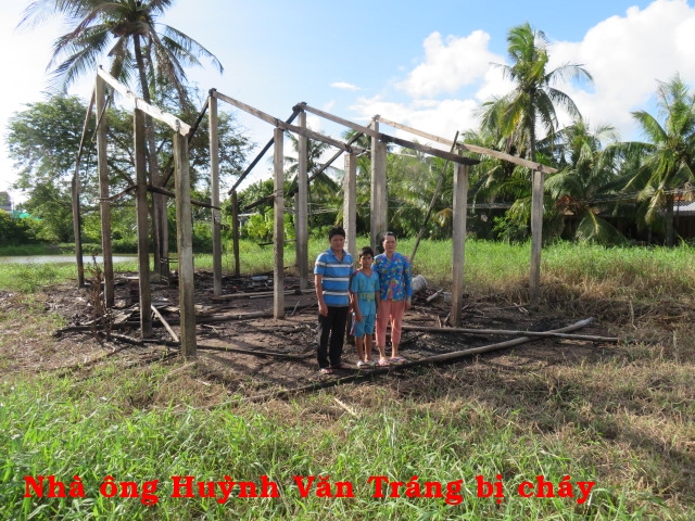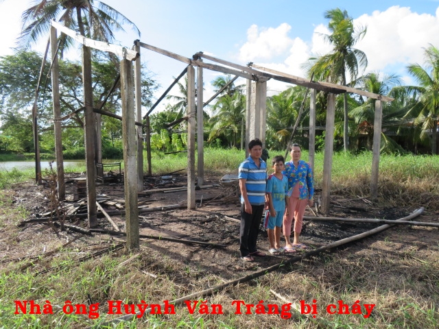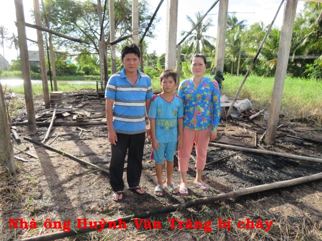 Ông Huỳnh Văn Tráng 37t ở ấp An Hòa xã Mỹ An huyện Thạnh Phú tỉnh Bến Tre. Gia đình có 3 người: vợ chồng và 1 con. Hàng ngày hai vợ chồng ai thuê gì làm nấy, cuộc sống chỉ đủ mua gạo. Căn nhà được cất nay hơn 8 năm làm bằng lá, cách nay 9 ngày căn nhà bị cháy hoàn toàn cả gia đình chỉ còn bộ đồ mặc trên người. Hiện tại chưa có tiền cất lại.