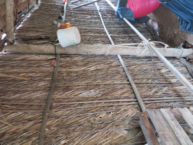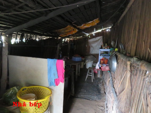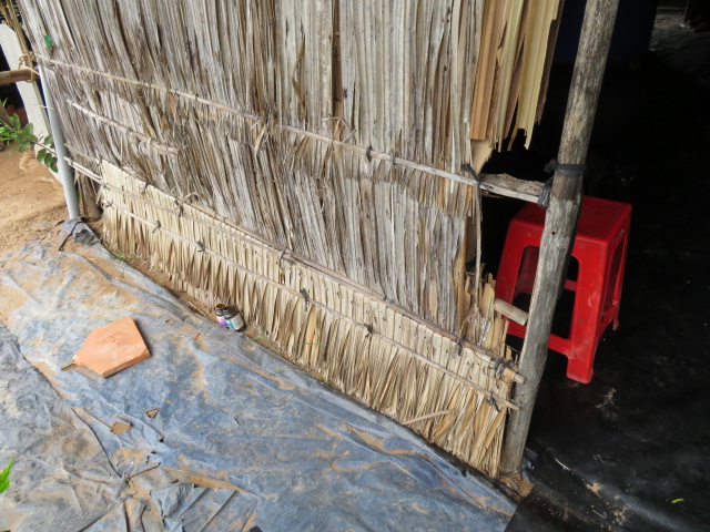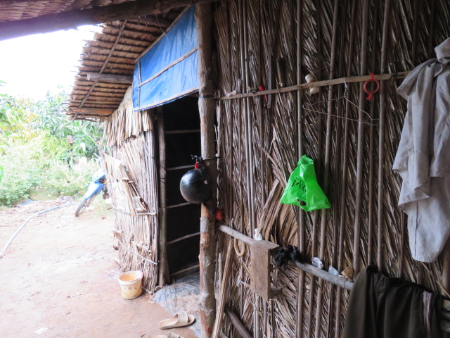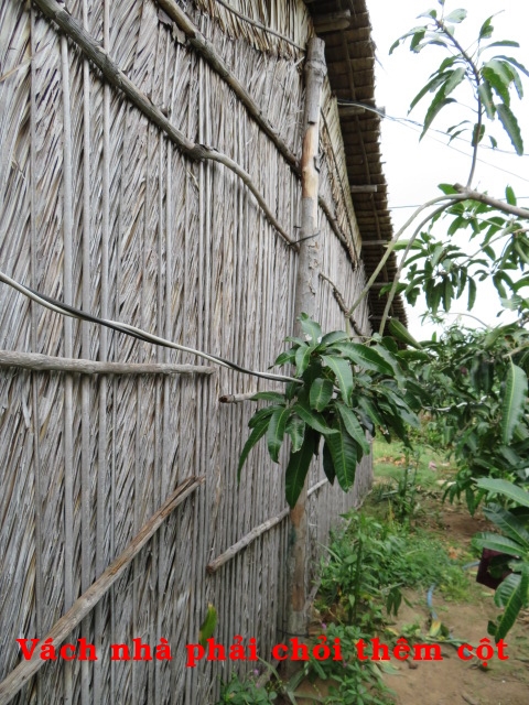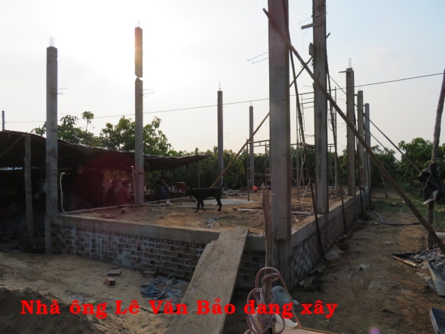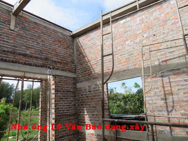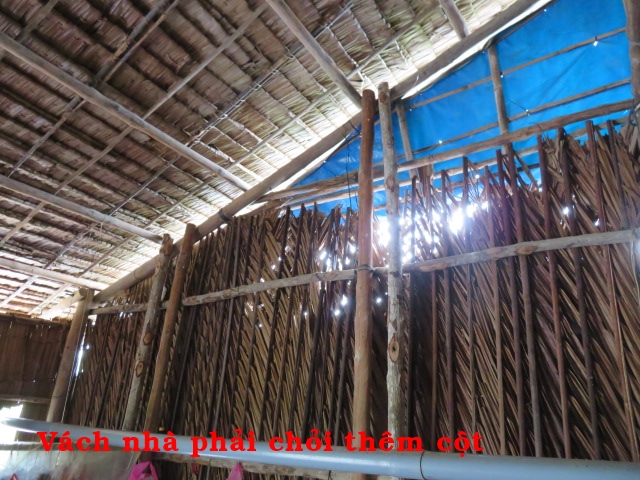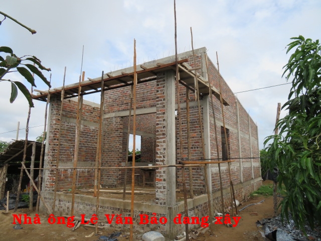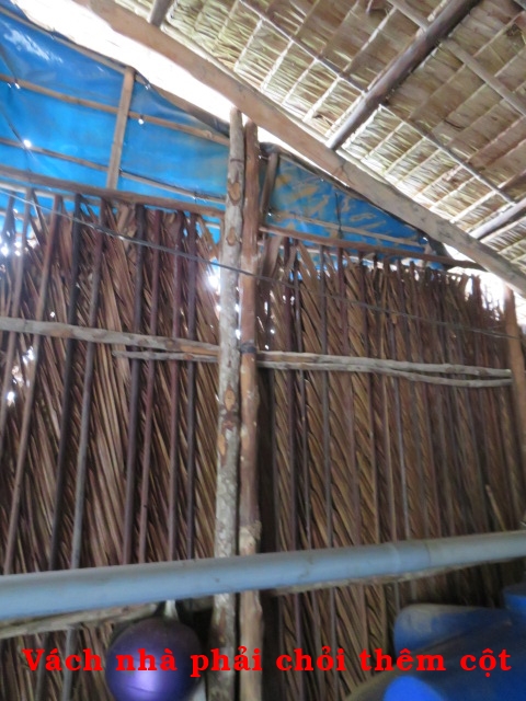 Mr. Le Van Bao, 36 years old, lives in Con Mit, Thanh Phong commune, Thanh Phu district, Ben Tre province. His family has four people: himself, his wife and their twochildren. Mr. Bao works as a day worker(whatever jobs he could find). The house has been built for more than 6 years agao with mangrove trees and leaves; now all the pillars have rotted. The house has to be supported by more trees or they will collapse, the leaves on the roof are also dilapidated. They do not have money to rebuild the house.