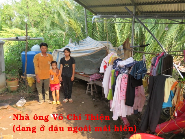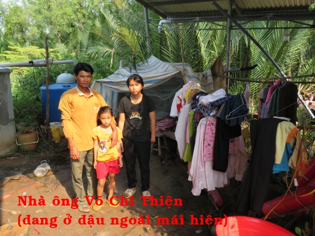 Ông Võ Chí Thiện 39t nhà ở ấp An Khương xã Mỹ An huyện Thạnh Phú tỉnh Bến Tre. Gia đình có 3 người: ông và 2 con, vì nghèo vợ ông bỏ đi. Hàng ngày ông đi bắt cá tép ngoài sông về bán đẻ kiếm sống và nuôi 2 con. Ông không có nhà, hiện tại cả gia đình ở đậu ngoài hiên nhà của xóm bỏ hoang. Người bà con thấy thương nên cho ông 1 nền nhà để xây mà không có tiền cất nhà.