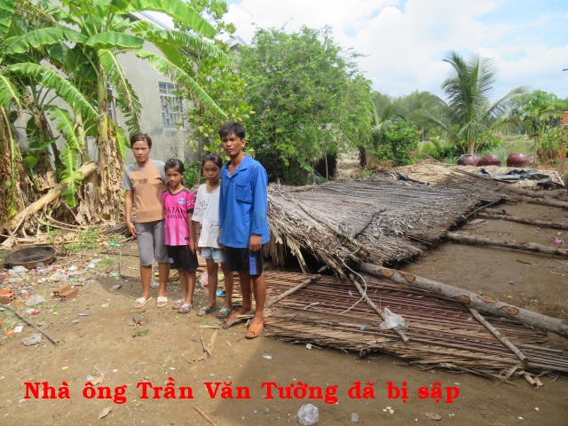 Nhà ông Trần Văn Tưởng, 36t nhà ở Cồn Cao, xã Thạnh Phong, huyện Thạnh Phú, tỉnh Bến Tre. Gia đình có 4 người: vợ chồng và 2 con. Nhà không có ruộng đất, hàng ngày ai thuê gì thì làm nấy. Căn nhà được cất nay hơn 8 năm hiện tại đã bị sập má không tiền cất lại.