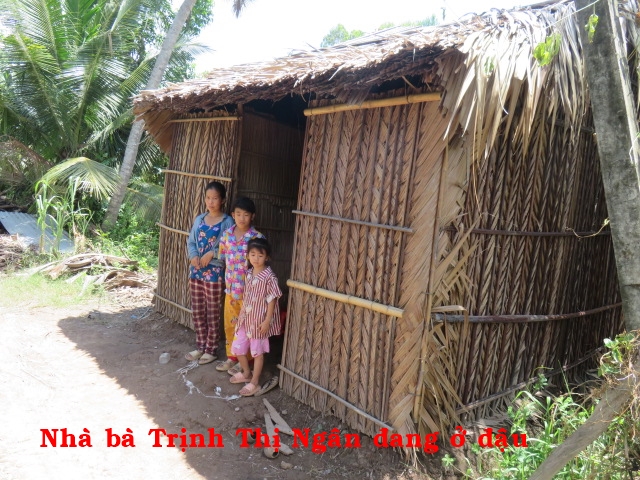 Nhà bà Trịnh Thị Ngân 37t nhà ở ấp Thạnh Mỹ, xã Mỹ An, huyện Thạnh Phú, tỉnh Bến Tre. Gia đình có 4 người: bà và 2 con, chồng bà bị đột quỵ mất nay hơn 1 năm, 2 đứa con còn đi học. Hàng ngày bà ai thuê gì thì làm nấy. Bà không có ruộng đất, nền nhà do chị cho ở. Hiện tại bà đang ở nhờ nhà bà con.