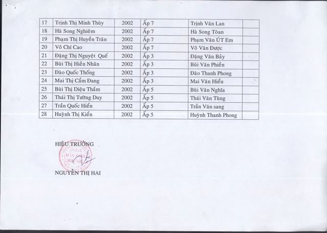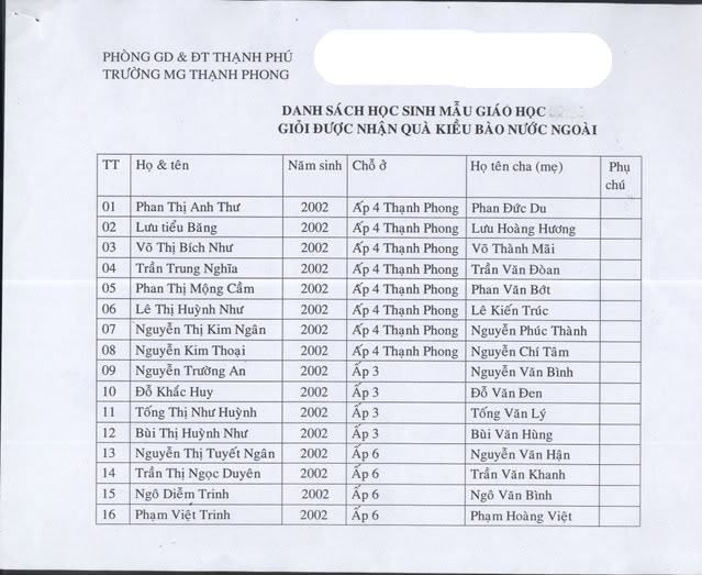 Danh sách các em được phát (28 em xuất sắc được chọn từ 7 lớp):