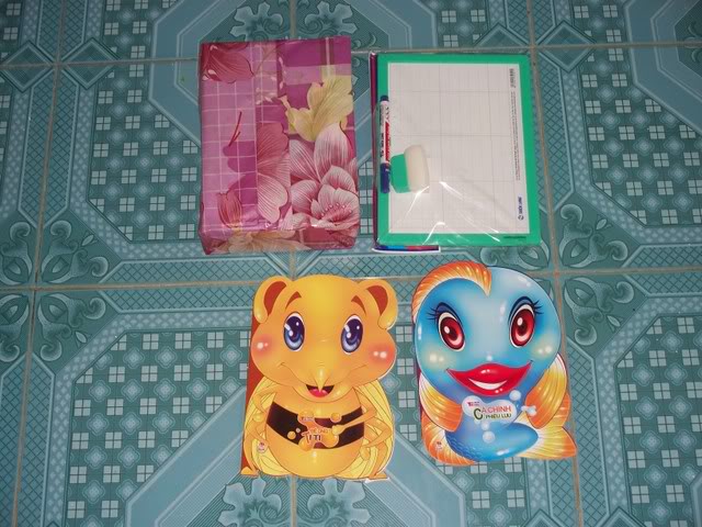 Đây là phần quà của các em . Mỗi em được một bộ sách giáo khoa để học cho lớp 1, một tấm