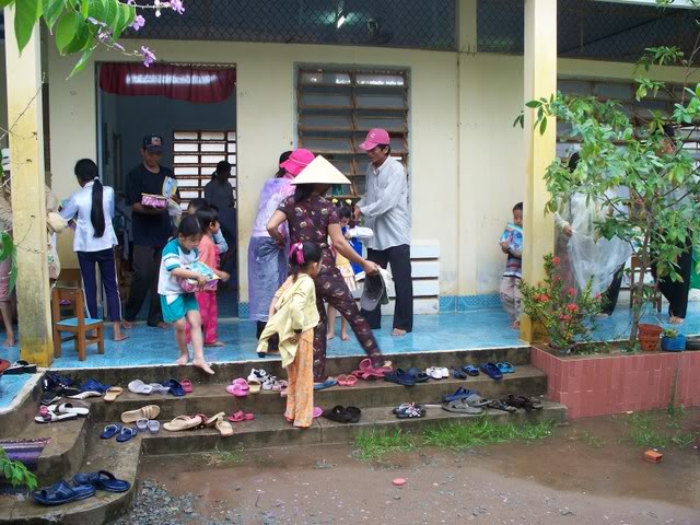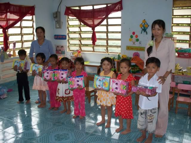Lảnh quà xong các em hấp tấp ra về. The kids hurried home after the ceremony was done.