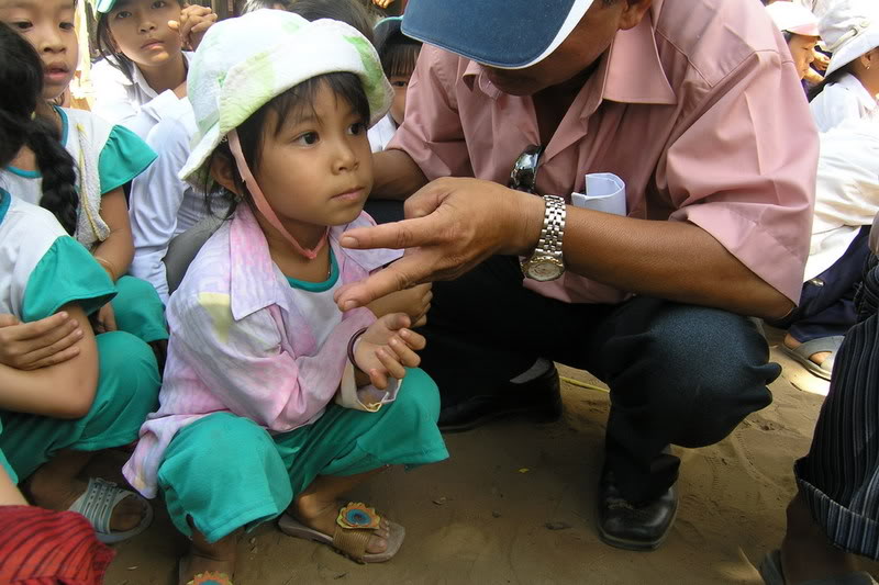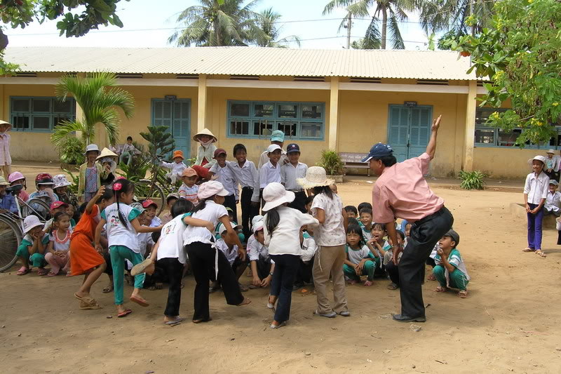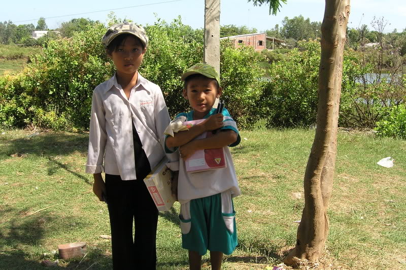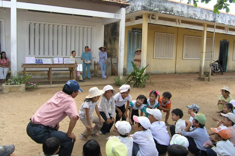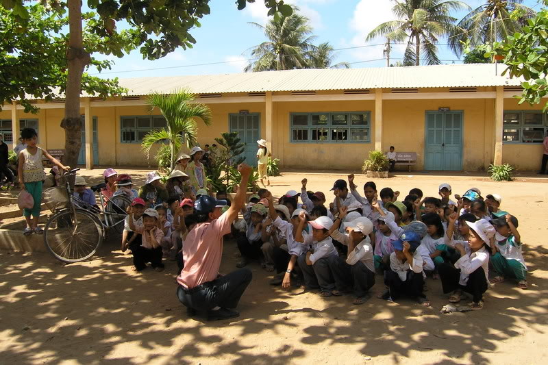 Trò chuyệnv với các cháu bé. Tại điểm này có cả các cháu bé lớp lá (mẫu giáo, hết hè này sẽ vào lớp 1) với đồng phục quần xanh