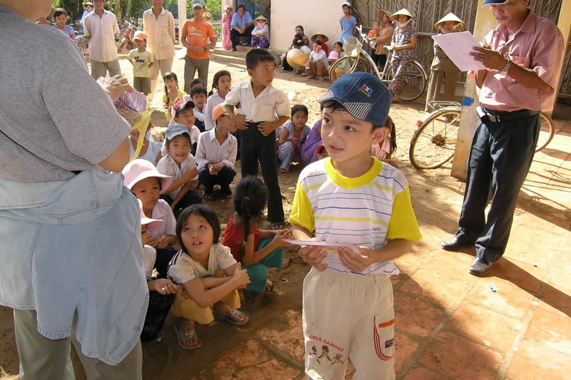 đọc tên các em trên danh sách ban giám hiệu trường trao lại, theo từng khối lớp, em có tên sẽ lên nhận bì thư từ tay Thỏ, 20 quyển vở từ tay Giáo viên ở trường, 2 cây bút từ tay Giáo viên khác (các Giáo viên phụ một tay với đoàn). Em nào có tên lên lãnh thì sẽ đánh dấu (/) đã nhận, tên em nào chưa đánh dấu thì sẽ nhận sau với Giáo viên.