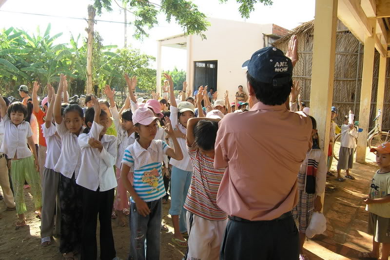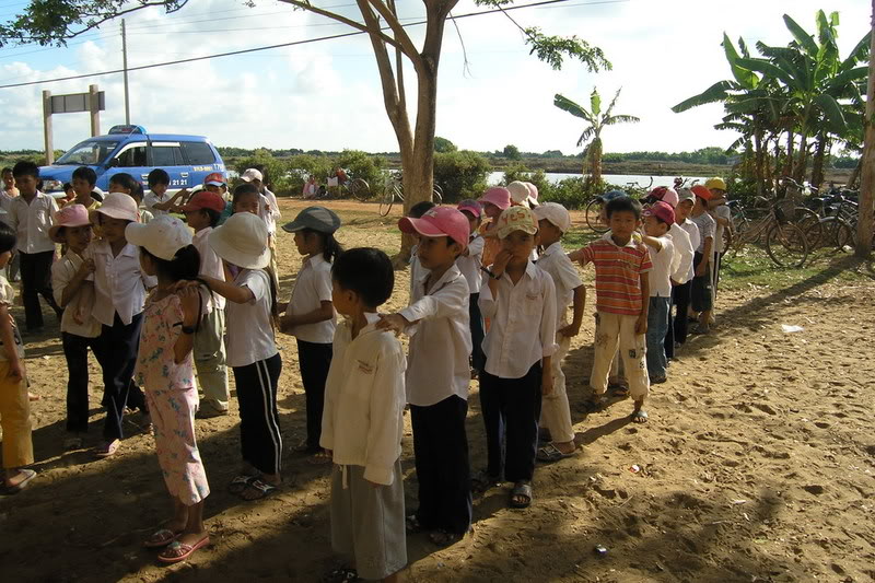 Vở và bút đã được đưa đến, các em được điều động ra sân xếp hàng, GV kiểm lại những em có mặt, những em vắng mặt, trước khi đoàn bắt tay vào phát bì thư và vở.