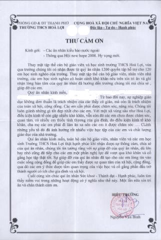 Thư cảm tạ – Letter of appreciation from the principal of Hòa Lợi High School