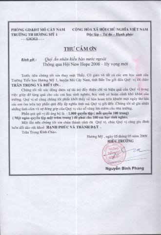 Thư cảm tạ – Letter of appreciation from the principal of Huong My elementary:
