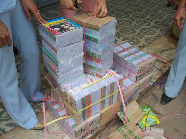 Mỗi em được 10 cuốn tập, mỗi cuốn 200 trang. Kèm theo đây là lá thơ cảm ơn của hiệu trưởng của trường, xác nhận số phần quà nhận được, và danh sách của 150 em nghèo được cấp bởi hiệu trưởng và xã Thạnh Phú. Phần sau là hình ảnh buổi phát tập tại trường hôm đó .