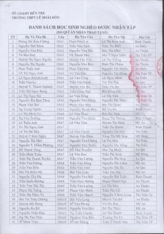 Chúng ta đã phát tập cho 150 em nghèotại trường trung học Lê Hoài Đôn trong tuần lể 06 tháng 5, 2009 . Trường trung học này còn được gọi bởi dân bản xứ là trường trung học phổ thông Cầu Ván hay là Trung Học Thạnh Phú tuy là tại quận Thạnh Phú thì cũng có trường tên Thạnh Phú rồi . Trường Lê Hoài Đôn nằm ngay bến phà Cầu Ván, và là trường trung học cấp 3 (lớp 10 tới 12) duy nhất đủ gần mà các em Xứ Cồn có thể đến được .
