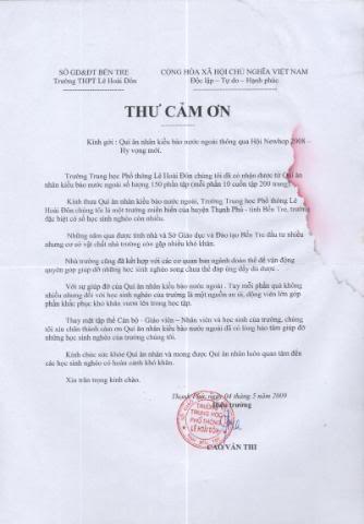 Thư cảm tạ – Letter of appreciation from the principal of Le Hoai Don High School