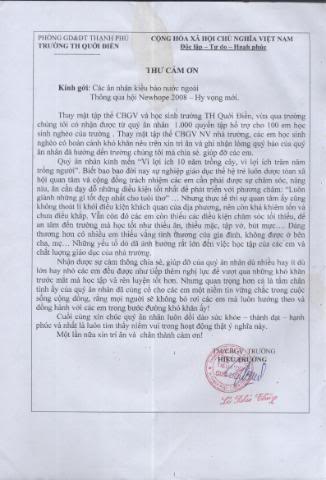 Thư cảm tạ – Letter of appreciation from the principal of Quới Điền elementary: