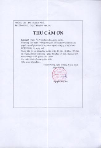 Thư cảm tạ – Letter of appreciation from the principal of Thạnh Phong Kindergarten (BonBon)