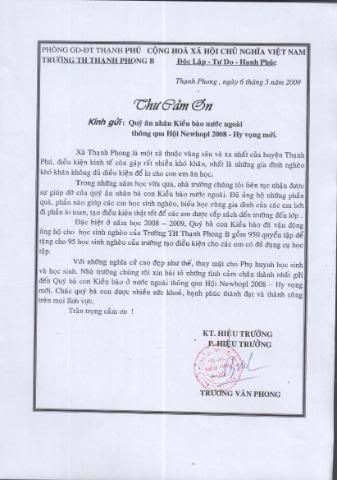 Thư cảm tạ – Letter of appreciation from the principal of Thạnh Phong B elementary: