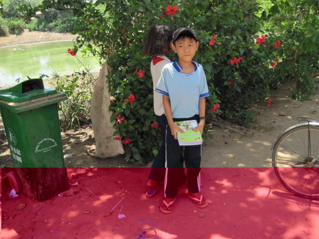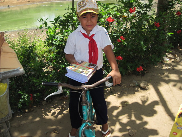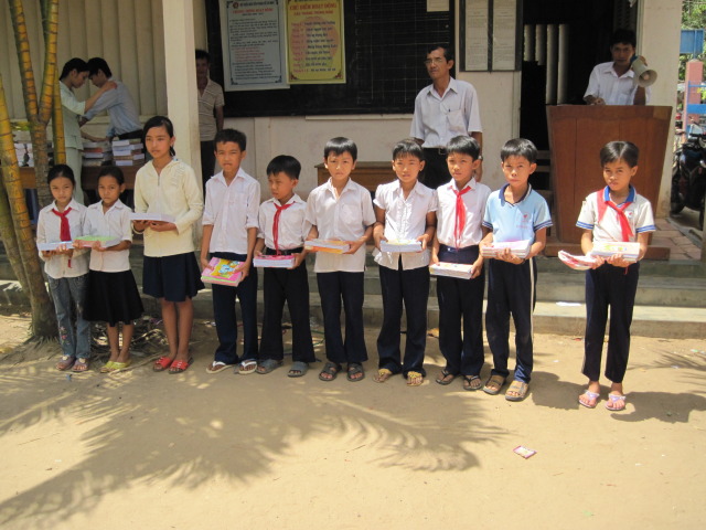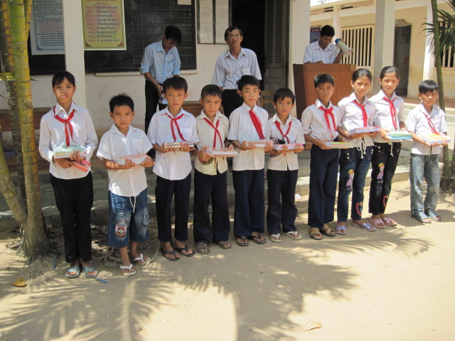 We have distributed notebooks to 120 needy students in An Binh Tay elementary in the morning of May 12th, 2010. Each got 10 notebooks, and each notebook is 100 pages.