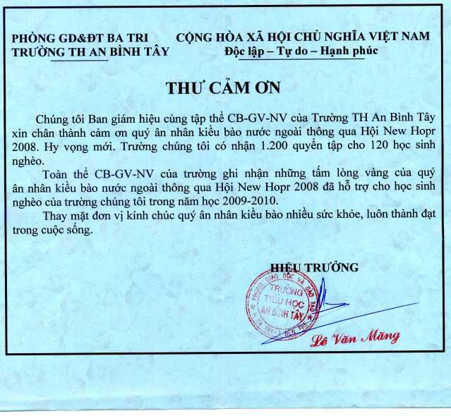 Kèm theo đây là lá thơ cảm ơn của hiệu trưởng của trường, xác nhận số phần quà nhận được, và danh sách của 120 em nghèo được cấp bởi hiệu trưởng. Phần sau là hình ảnh buổi phát tập tại trường hôm đó .