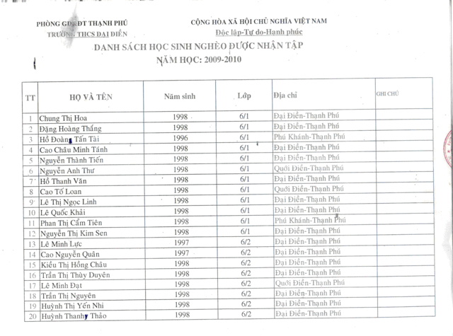2010 - Phát tập cho các em nghèo của trường Trung Học Cấp 2, Đại Điền