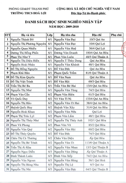 2010 - Phát tập cho các em nghèo của trường Trung học Hòa Lợi