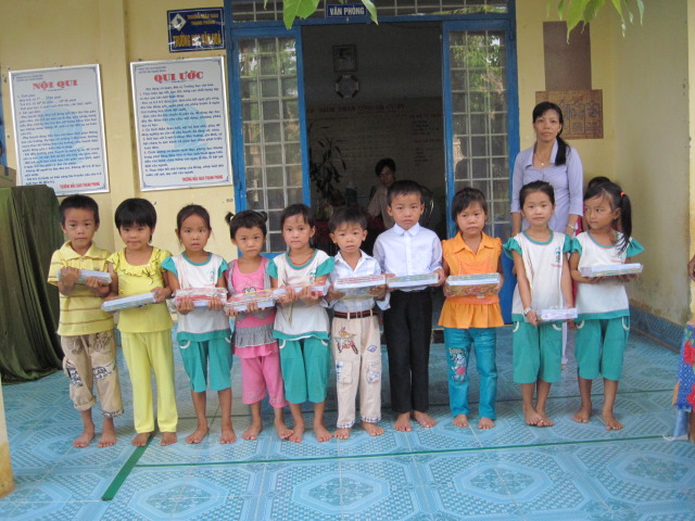 Các em này đã học xong mẫu giáo và năm sau sẽ lên lớp 1. Tuy nhiên, có em nhà quá nghèo cha mẹ không mua nổi dụng cụ để đi học như tập, sách, và viết nên đã không cho các em đi học nửa. Ở lứa tuổi các em, tập và viết là hai học cụ cần thiết nhất để tiếp tục học . Chúng ta đã tặng cho mỗi em 10 cuốn là vừa đủ để các em dùng trọn một năm học. Hy vọng sự giúp đở này sẽ giúp cho các em được tiếp tục học .