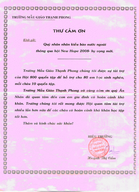 Thư cảm tạ – Letter of appreciation from the principal of Thạnh Phong kindergarten:
