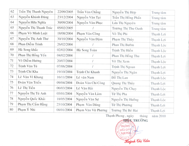 Kèm theo đây là lá thơ cảm ơn của hiệu trưởng của trường, xác nhận số phần quà nhận được, và danh sách của 80 em nghèo được cấp bởi hiệu trưởng.