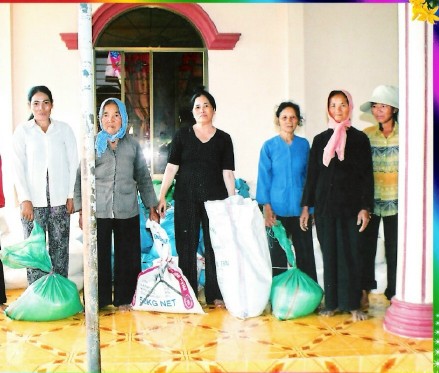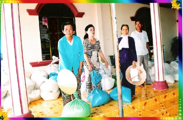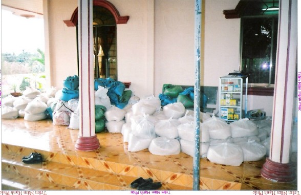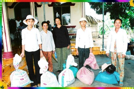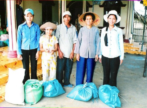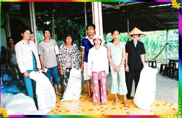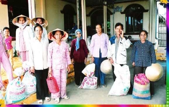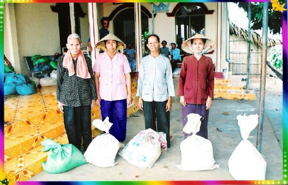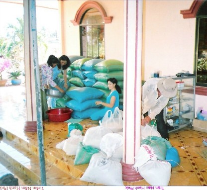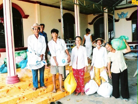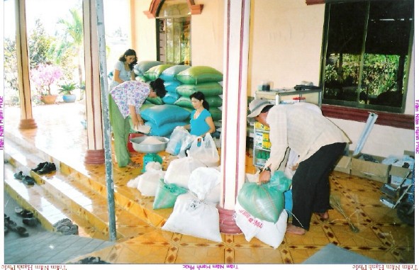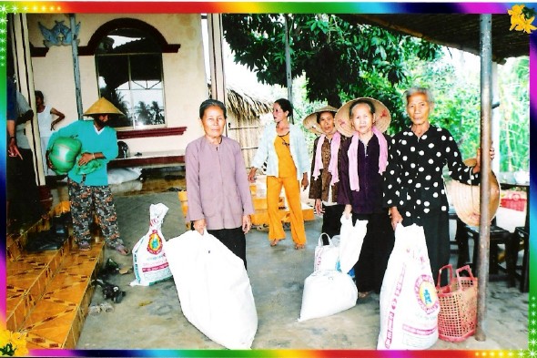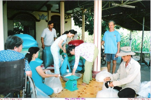Chúng ta mua đuợc 4 tấn gạo và lẻ mấy lít, và đã phát ra cho đuợc 200 nguời , mỗi nguời 20 ký lô. Một số nguời già cả đi không nổi thì đuợc xe chở giao đến nhà. Một số nguời đi làm mướn đến chiều mới về lấy nên không có mặt trong buổi phát gạo.