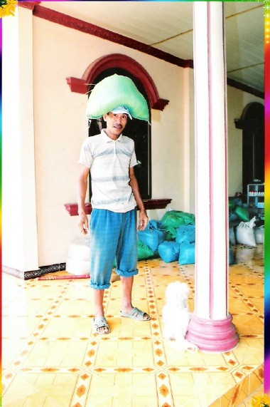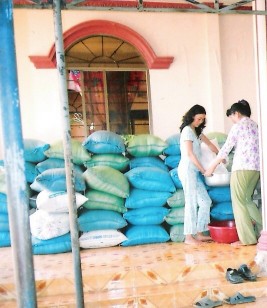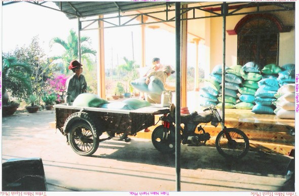 Tới chỗ phát gạo và đang được đem xuống. Chỗ phát gạo là nhà của bà con mẹ tôi, cho mượn để làm (cùng chỗ tôi đã phát năm ngoái ):