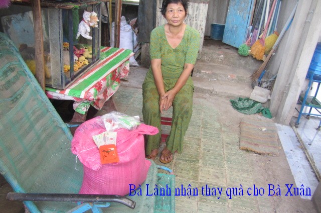 40. Bà Nguyễn Thị Lành, 67 tuổi. Bà nuôi mẹ già là bà Lê Thị Xuân, 94 tuổi. Bà Xuân không nhận quà nổi nhờ con bà là bà Lành nhận dùm. Cả hai mẹ con đang ở tại ấp Thạnh Quí A, xã Bình Thạnh, huyện Thạnh Phú, tỉnh Bến Tre.