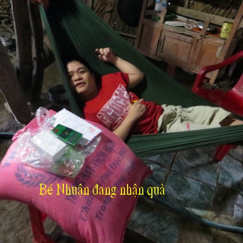 36. Mr. Nhuan Van Huynh, 29 years old, living in An Ngai B sub-hamlet, An Thanh hamlet, Thanh Phu district, Ben Tre province. Mr. Huynh has been paralyzed since he was still a baby. He can only lie on the hammock all day and is unable to perform daily activities. His mother helps him with his personal hygiene.