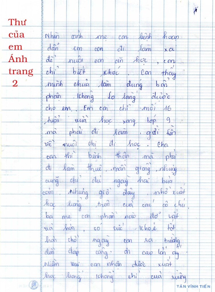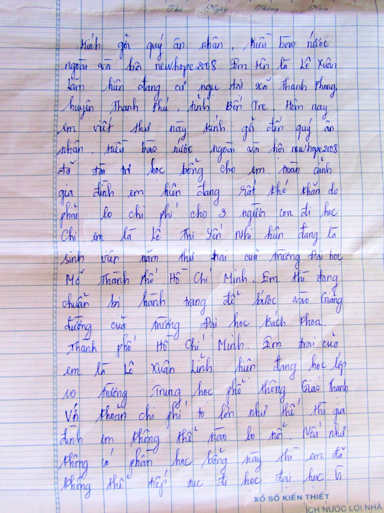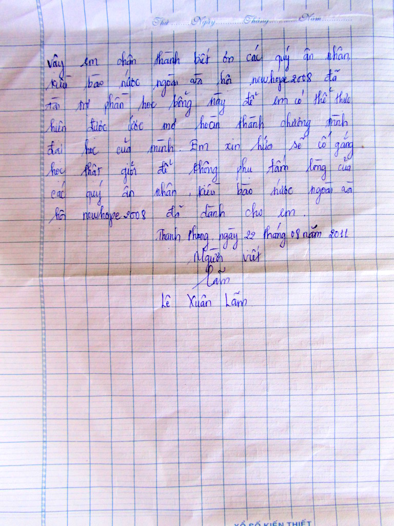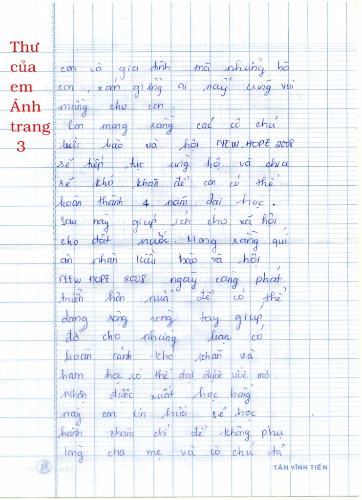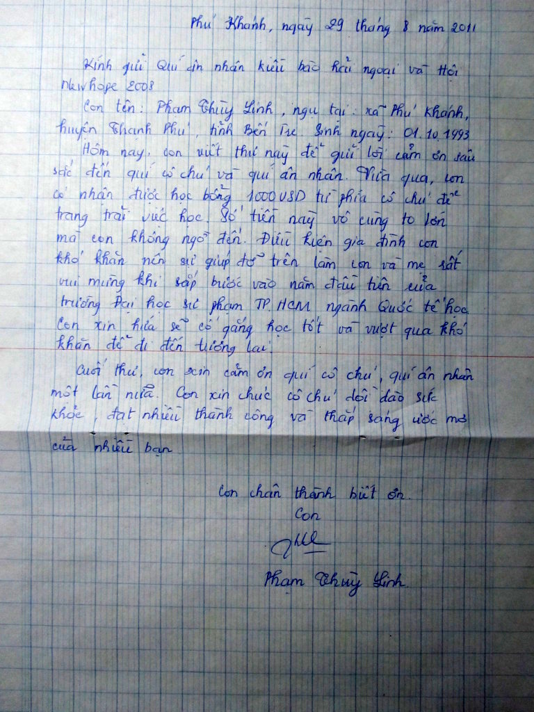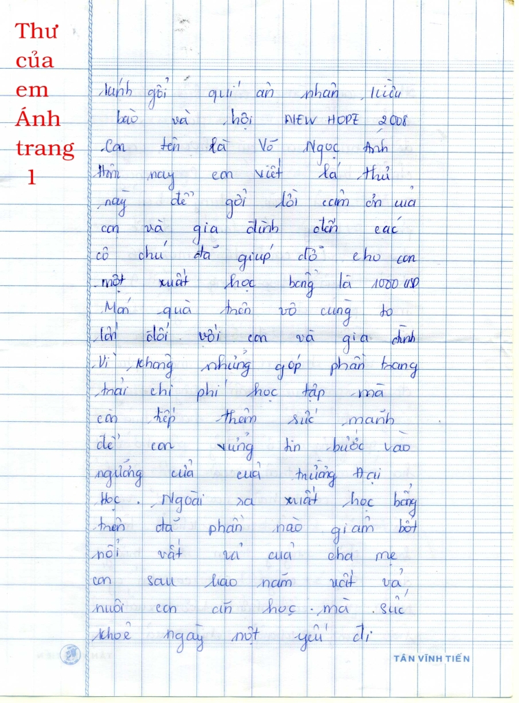 My name is Vũ Ngọc Ánh, the recipient of your 1000USD scholarship. I am writing to express the great appreciation my family and I feel about your gift. It will be of enormous help to my family to pay for school fees and to allow me to hopefully attend university. It has eased some of the hardship my parents have had in raising me, particularly with their health concerns.