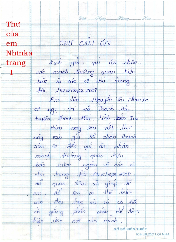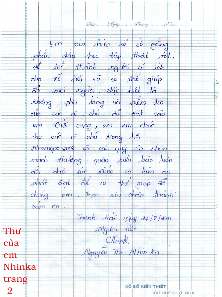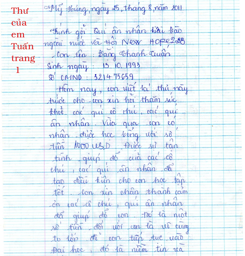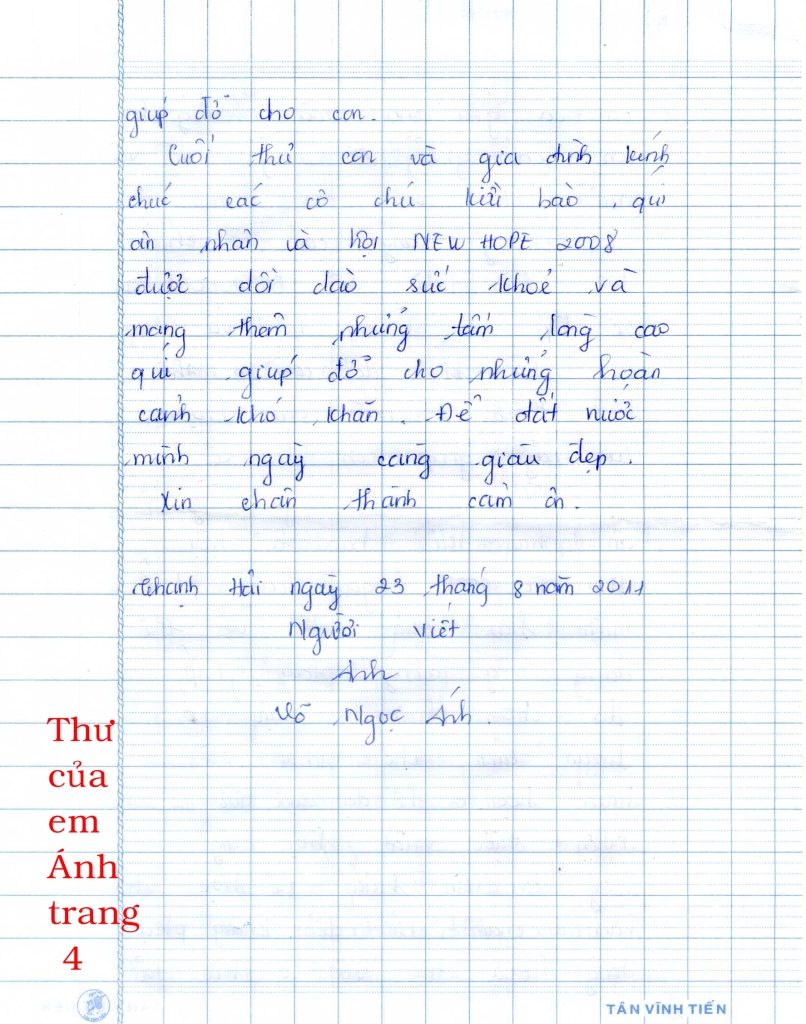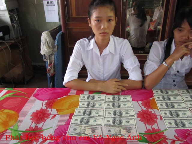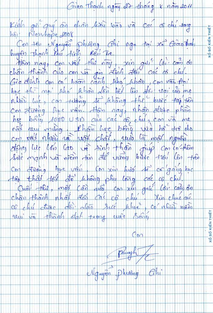 My name is Vũ Ngọc Ánh, the recipient of your 1000USD scholarship. I am writing to express the great appreciation my family and I feel about your gift. It will be of enormous help to my family to pay for school fees and to allow me to hopefully attend university. It has eased some of the hardship my parents have had in raising me, particularly with their health concerns.