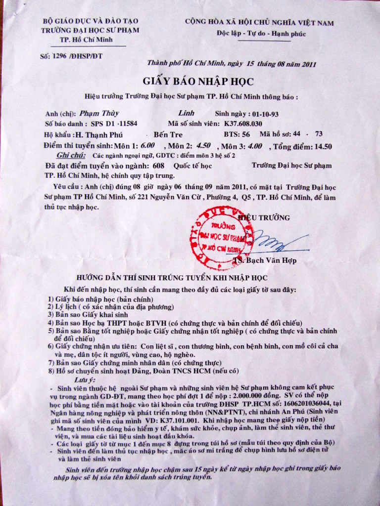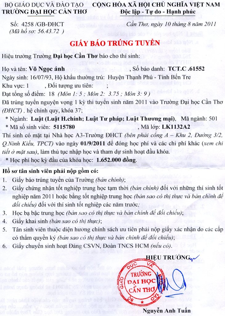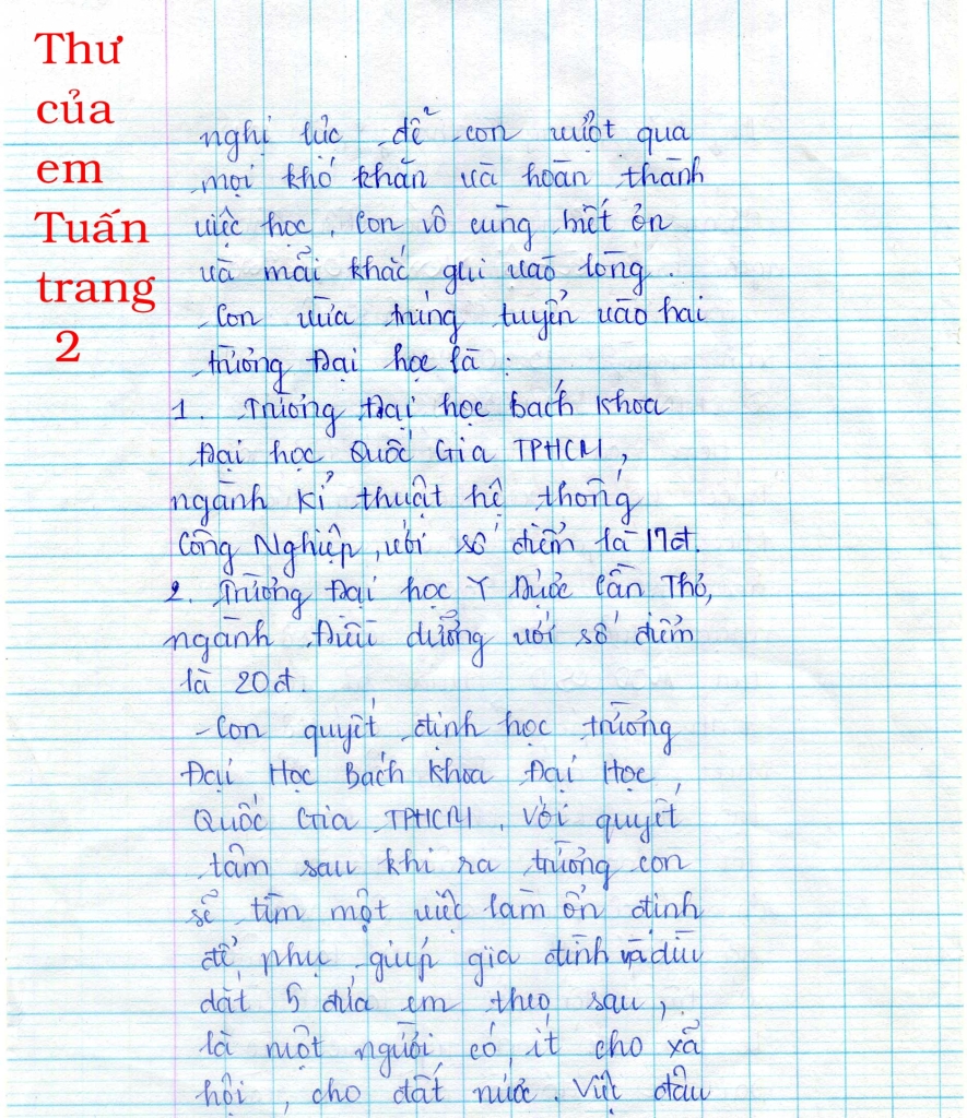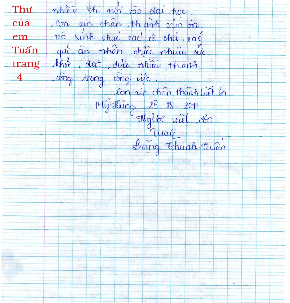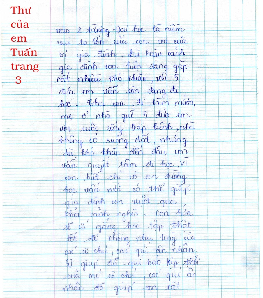 My name is Vũ Ngọc Ánh, the recipient of your 1000USD scholarship. I am writing to express the great appreciation my family and I feel about your gift. It will be of enormous help to my family to pay for school fees and to allow me to hopefully attend university. It has eased some of the hardship my parents have had in raising me, particularly with their health concerns.