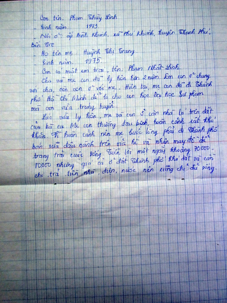 Võ Ngọc Ánh ở ấp Thạnh Hưng xã Thạnh Hải (Cồn Rừng) nhà có hai chị em. Em nay 16t, đi theo mẹ lên Sài Gòn làm thuê để kiếm tiền về trả nợ vì cha ở nhà bị mổ sạn thận 3 lần, cuộc sống rất thiếu thốn khó khăn. Hiện tại cha em ở nhà làm đất và ai thuê gì thì làm nấy, thu nhập không ổn định. Em đậu vào Đại Học Cần Thơ, khoa luật. Em rất cần sự giúp đở để được theo học đại học.