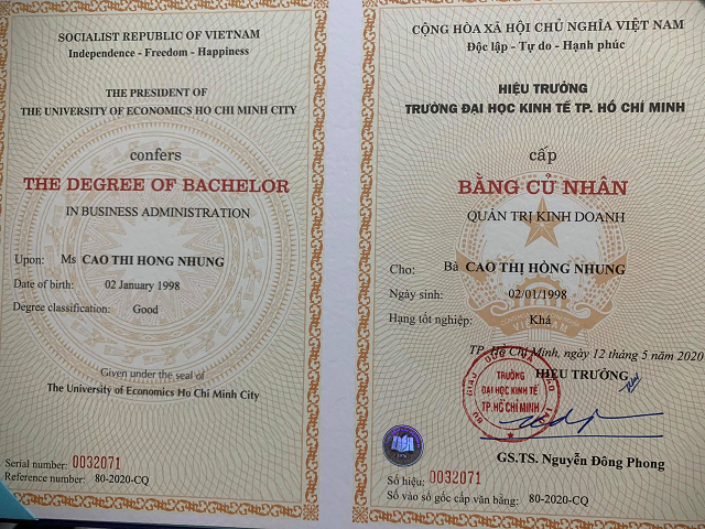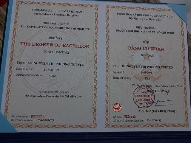 Con là Cao Thị Hồng Nhung - sinh viên trường Đại học kinh tế TPHCM, con gửi đến Cô Chú bằng Tốt nghiệp con vừa nhận được ạ. Nhờ sự yêu thương và giúp đỡ của Cô Chú ngày hôm nay con đã nhận được tấm bằng này và có nhiều cơ hội ở tương lai. Con không biết nói gì hơn ngoài lời cảm ơn chân thành nhất đến Cô Chú. Con chúc Cô Chú luôn mạnh khỏe, hạnh phúc, Chúc Hội mình sẽ phát triển hơn có thể giúp nhiều bạn học sinh khó khăn hơn nữa. Con sẽ cố gắng thật nhiều ở tương lai và sẽ cố gắng chung tay với Cô Chú trên hành trình giúp đỡ các bạn học sinh khó khăn có thể thực hiện ước mơ Đại học.