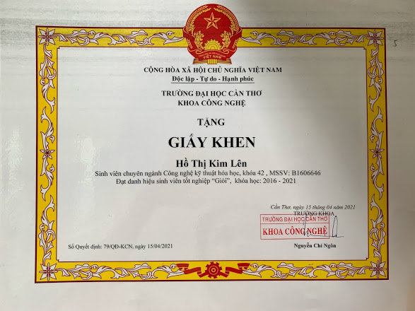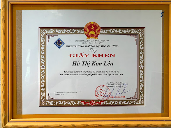 Con tên là Hồ Thị Kim Lên, ngành Công nghệ Kỹ thuật Hóa học, trường Đại học Cần Thơ.