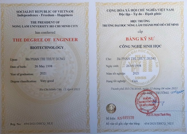 Con tên Phan Thị Thuỳ Dung, học ngành Công nghệ Sinh học, trường Đại học Nông Lâm thành phố Hồ Chí Minh
