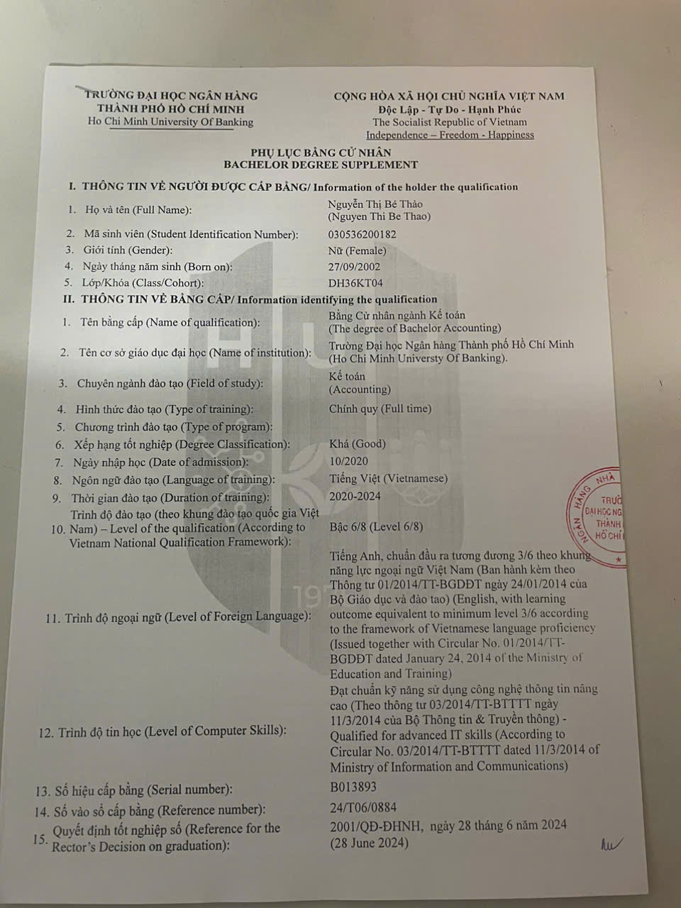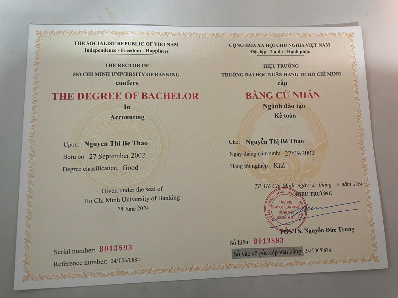 Con là Nguyễn Thị Bé Thảo, sinh viên năm 2020 hiện tại con đã tốt nghiệp chuyên ngành Kế toán trường Đại học Ngân hàng thành phố Hồ Chí Minh.