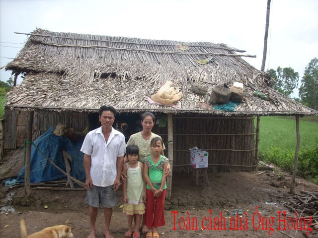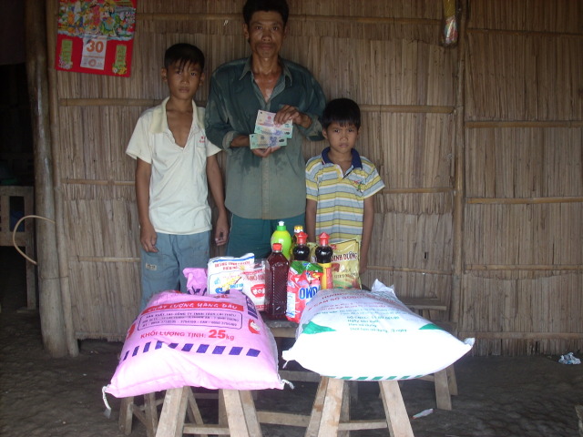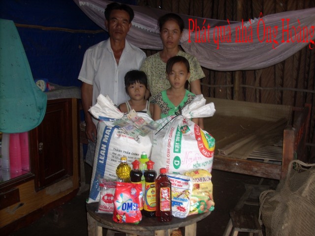 1. Ông Nguyễn Văn Hoàng 42 tuổi. Địa chỉ 124/3 ấp Thạnh tân, xã Bình Thạnh vợ ông là Bà Đoàn Thị Bích Thủy 32 tuổi. Có 2 con gái 9 tuổi học lớp 4 và 6 tuổi học lớp 1. Ông không có nhà. Hiện tại ông đang ở đậu nhà của người hàng xóm. Ông làm bằng nghề kéo lưới cá ở dưới sông mỗi ngày thu hập khoảng 30.000 đến 40.000 đồng ( 1,5 đến 2 đô) Vợ ông bị bệnh đau nhức khớp nên không làm được việc gì có thêm thu nhập. cả nhà sống chủ yếu dựa vào tiềnkiế, được của ông. Ông cám ơn tấm lòng hảo tâm đã cho ông phần quà.