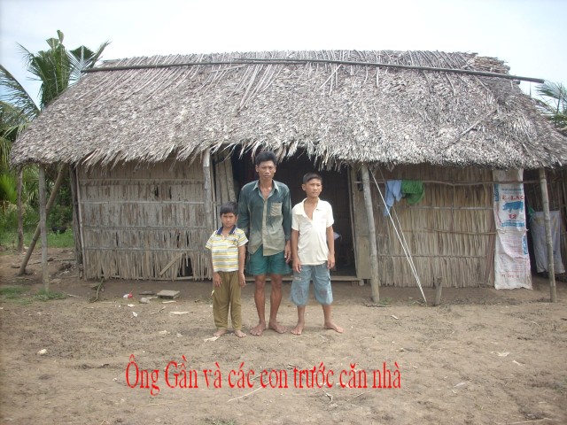 2. Ông Nguyễn văn Gần 33 tuổi, số nhà 80/3 ấp Thạnh Tân xã Bình Thạnh. Vợ ông Bà Nguyễn Thị Kiên 32 tuổi đã ly dị với ông và để lại cho ông 2 con trai 11 tuổi học lớp 6 và 8 tuổi học lớp 3. Ông bị bệnh đau thần kinh tọa nên không làm được việc nặng. Hàng ngày ông sống bằng việc mò cá tép dưới sông mỗi ngày được khoảng 20.000 đồng ( 1 đô ) mà không phải lúc nào cũng có. Gạo thì được bà con hàng xóm thương tình cho để có cái ăn hàng ngày. Ông rất biết ơn tấm lòng từ thiện của người đã cho ông một phần quà.