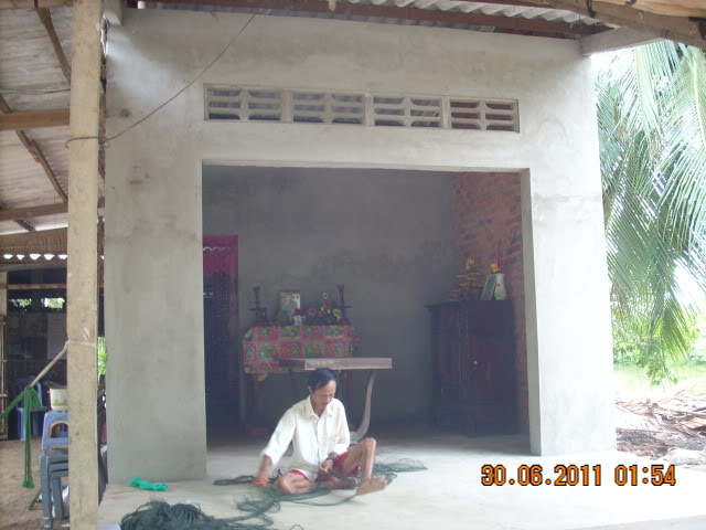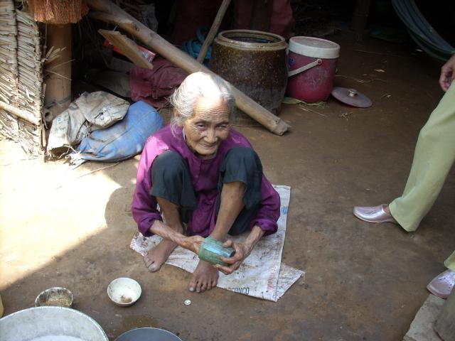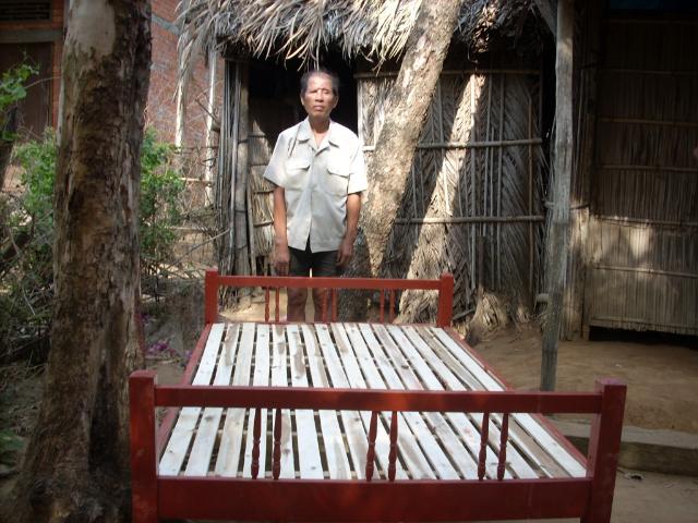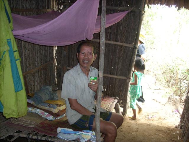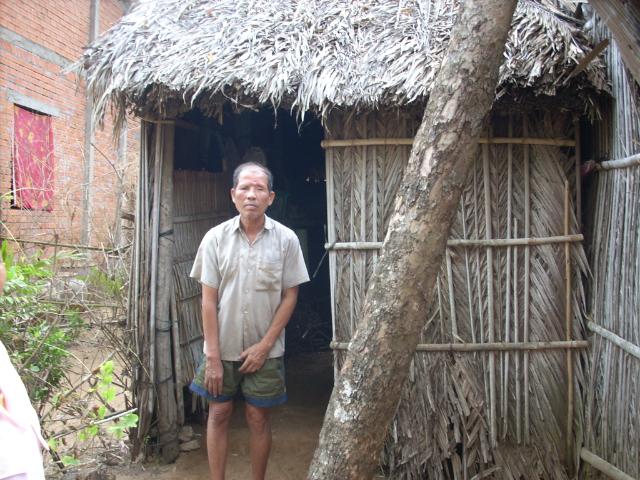 His situation is as follows: before April 30th, 1975, Mr. Dao was a soldier in the Tra Vinh province. He had a wife and a son. While in the army, Mr. Dao was hit by a bullet on his head that paralyzed half of his body in 1974. From then on, we walked with a cane. His wife had since left him. Mr. Dao moved back to his birth place to the hamlet of Binh Thanh to live. He goes begging daily and does whatever he can to pay for his visit with his grand children in Tra Vinh.