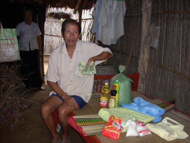Hoàn cảnh của ông như sau: trước trước ngày 30 tháng 4 ông đi lính ở Trà Vinh và có vợ ở đó, có 1 người con trai nhưng cũng vì đi lính mà ông không may bị viên đạn bắn trúng vào đầu (tam tinh) năm 1974, kể từ đó ông bị liệt hết nửa người nên khi đi phải chống gậy. Cũng vì vậy mà vợ ông đã bỏ ông, nên ông về quê ông để sống ( xã Bình Thạnh ) cho đến ngày nay. Ông hàng ngày đi xin từng lít gạo để sống, và ngòai ra ông còn cố gắng làm bất cứ chuyện gì ông có thể làm được để kiếm tiền xe đi thăm cháu nội ở Trà Vinh . Nhận được phần quà này ông mừng như được trúng số và gởi lời cám ơn đến các vị ân nhân.