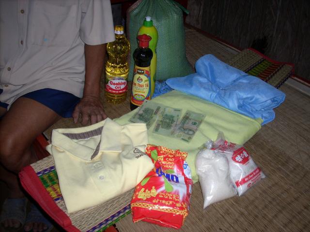 1 bed, 1 straw mat, 1 mosquito net, 22 lbs of rice, 1 bottle of soy sauce, 1 bottle of cooking oil, 2.2 lbs of detergent, 1 pouch of seasoning powder, 1 lbs of sugar, 1 bottle of dish detergent and VN$300,000.00 in cash. In addition, there was a blanket and a T-shirt given by our friends Nghia Pham and Long Tien Nguyen.