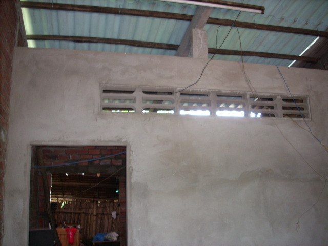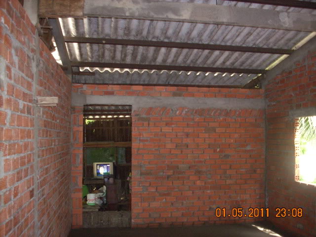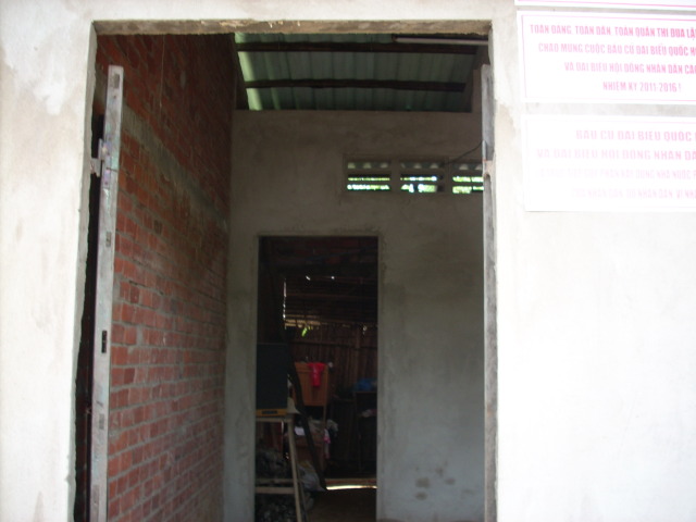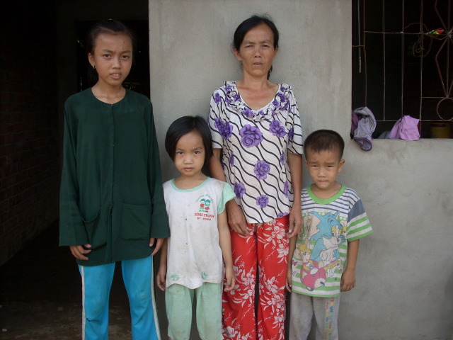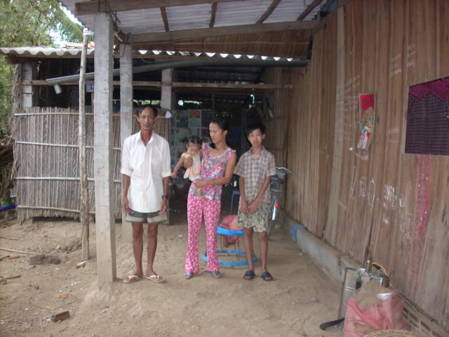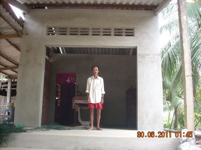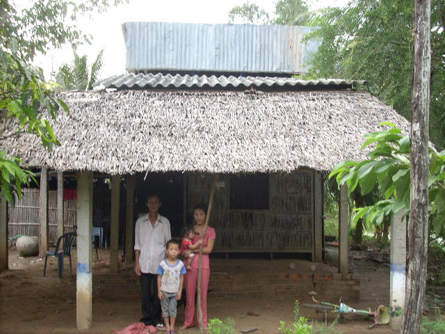 Mr. Le’s roof was done. A friend had given him 6 aluminum roof panels. That saved him VN$480,000 (roughly US$24.00) to which he used to plaster the interior of 2 walls. Mr. Le was gone the next day to Long Khanh for an irrigation job at some coffee, almond, black pepper plantations. We could only take photographs of his wife and children in front of the house with its new roof. This is indeed a poor family. On the 2nd lunar month every year, Mr. Le works as a migrant worker in the southeastern part of the country for VN$70,000/day (roughly US$3.00/day). This line of work only lasts for 3 months. The rest of the year, Mr. Le works as an assistant brick layer. Due to his age and a weak leg, this type of work is very hard for him. Not to mention it is also sporadic. His wife is un-employed and stays home. With his income, feeding 5 mouths has been very difficult. Now that the house has a roof, the family finally has a place to take refuge from the menacing rain and heat. He felt as if a genie in a dream has fulfilled his wish. Mr. Le was deeply grateful for the help he received.