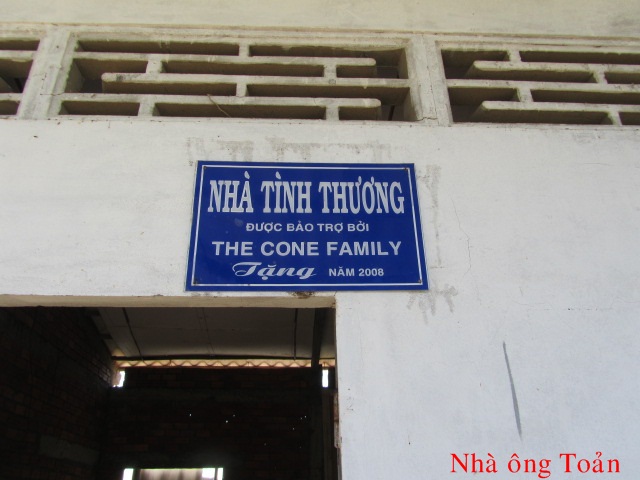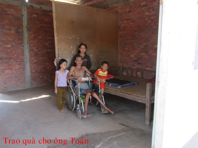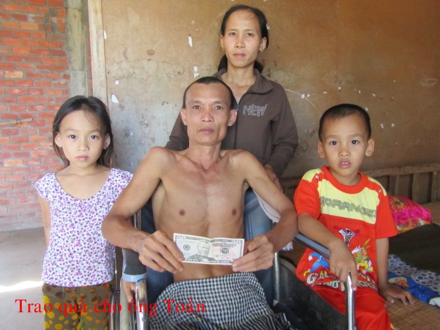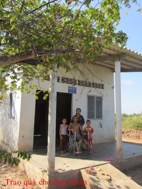 Ông Nguyễn Văn Tỏan truớc đây làm nghề lái xe Honda và trong một vụ tai nạn đã bị tàn phế không còn đi đuợc nửa. Ông có vợ và 2 con nhỏ. Năm 2008 đuợc sự bảo trợ của gia đình họ Cone chúng tôi đã xây cho gia đình ông một căn nhà tình thương. Năm nay gia đình họ Cone nhờ chúng tôi ghé thăm và trao cho gia đình ông $50 đô. Đây là hình ảnh trao quà: